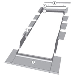 Kołnierz składa się z elementu dolnego, z elementów bocznych, których ilość zależna jest od wysokości okna oraz z elementu górnego. Profilowane elementy boczne kołnierza przekładane są na przemian z pokryciem dachowym, ściśle przylegając do materiału pokryciowego. Dwa pierwsze modułowe elementy boczne wykonane są z miękkiej blachy co pozwala na samodzielne wygięcie i bardzo dokładne dopasowanie ich do pokrycia dachowego. Dolny element posiada podklejoną od spodu masę plastyczną pozwalającą na przyklejenie kołnierza do pokrycia dachowego, przez co zapewniona jest szczelność połączenia. Standardowo do kołnierza dołączona jest rynienka odwadniająca mająca na celu odprowadzenie skroplin pary wodnej z folii wstępnego krycia poza okno. |