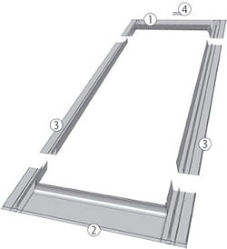 Kołnierz składa się z czterech podstawowych elementów (dolny element, dwa boczne i górny element). Dolny element kołnierza posiada podklejoną od spodu masę plastyczną pozwalającą na przyklejenie kołnierza do pokrycia dachowego, przez co zapewniona jest szczelność połączenia. |