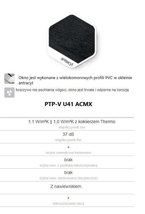 Okno wykonane jest z wielokomorowych profili PVC w okleinie antracyt. Oblachowanie zewnętrzne okna RAL7016 (antracyt)
