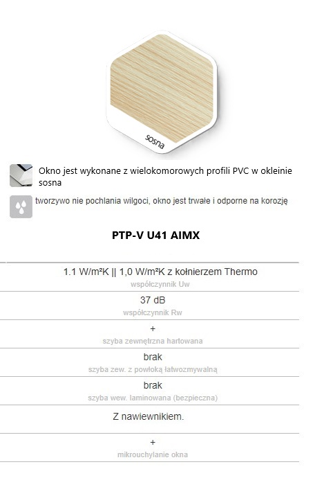 - Okna są wykonane z wielokomorowych profili PVC w okleinie sosna. Tworzywo nie pochłania wilgoci.