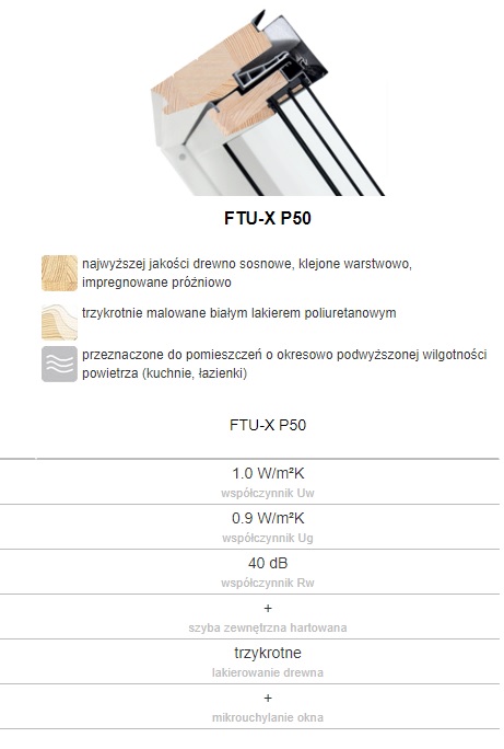 Okna dachowe FTU-X P50 z nowej z linii GREENVIEW to drewniane okna obrotowe malowane trzykrotnie malowane białym lakierem poliuretanowym. Okna z pakietem szybowym typu P50 (3 szybowe, 2komorowe) z powłoką łatwozmywalną, szyba wewnętrzna bezpieczna–laminowana, zewnętrzna szyba hartowana z dożywotnią gwarancją na rozbicie przez grad. Okna wykonane w technologii thermoPro oraz topSafe. Okna mogę być przeznaczone do pomieszczeń o okresowo podwyższonej wilgotności powietrza (kuchnie, łazienki).