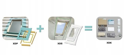 Gotowy pakiet kołnierzy XDK do szybkiego wykonania prawidłowej izolacji termicznej, paroprzepuszczalnej i paroszczelnej wokół okna dachowego. Pakiet XDK to XDP+XDS