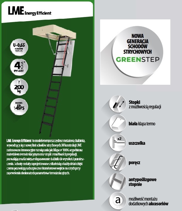 LME Energy Efficient to model energooszczędny z metalową drabinką, wywodzący się z nowej linii schodów strychowych. W konstrukcji LME zastosowano innowacyjne rozwiązania jak: klapa w 100% wypełniona materiałem termoizolacyjnym oraz stopki z możliwością regulacji, pozwalające na łatwiejsze dopasowanie drabinki do wysokości pomieszczenia. Schody zostały zaprojektowane z dbałością o każdy detal dzięki czemu pozwalają na bezpieczne i komfortowe wejście na strych przy zapewnieniu doskonałych parametrów termoizolacyjnych.