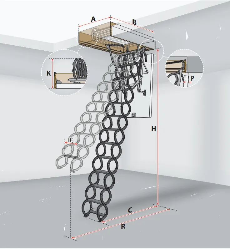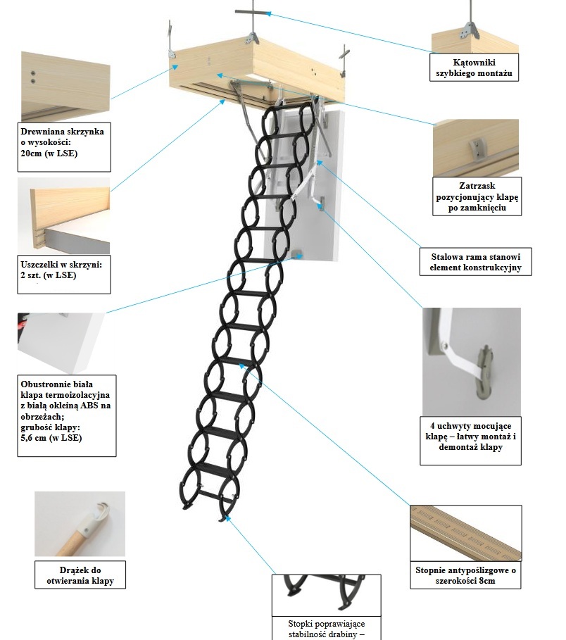- Schody posiadają system dopasowania długości drabinki do wysokości pomieszczenia