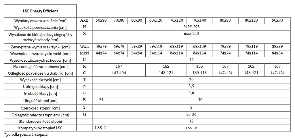 Schody Strychowe GREENSTEP LSE Energy Efficient to nowoczesne schody nożycowe, które łączą komfort użytkowania z energooszczędnością. Obustronnie biała klapa termoizolacyjna, wykończona elegancką okleiną ABS, doskonale wtapia się w sufit, tworząc spójną i estetyczną całość z każdym wnętrzem. Charakterystyczne policzki w kształcie litery „S” pełnią rolę poręczy na całej wysokości schodów, co znacząco podnosi komfort i bezpieczeństwo użytkowania. Grubość klapy wynosząca 56 mm, dwie uszczelki oraz współczynnik przenikania ciepła U=0,65 W/m²K zapewniają doskonałą izolację termiczną, co przekłada się na niższe koszty ogrzewania. Dzięki harmonijkowej konstrukcji i systemowi regulacji długości drabinki, schody te świetnie sprawdzą się w pomieszczeniach o niewielkich rozmiarach. Można je zamontować w otworach o wymiarach już od 50x80 cm do 80x120, schody standardowo dostępne w 9 wymiarach. Istnieje możliwość ich wykonania w wymiarach pod dedykowany wymiar otworu montażowego, Solidna, metalowa drabinka wytrzymuje obciążenie do 200 kg, zapewniając trwałość i bezpieczeństwo. Możliwość wydłużenia drabinki do wyższych pomieszczeniach do 338 cm przez dołożenia dodatkowych stopni LSS.