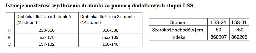 - Możliwość wydłużenia drabinki do wyższych pomieszczeniach do 338 cm przez dołożenia dodatkowych stopni LSS.