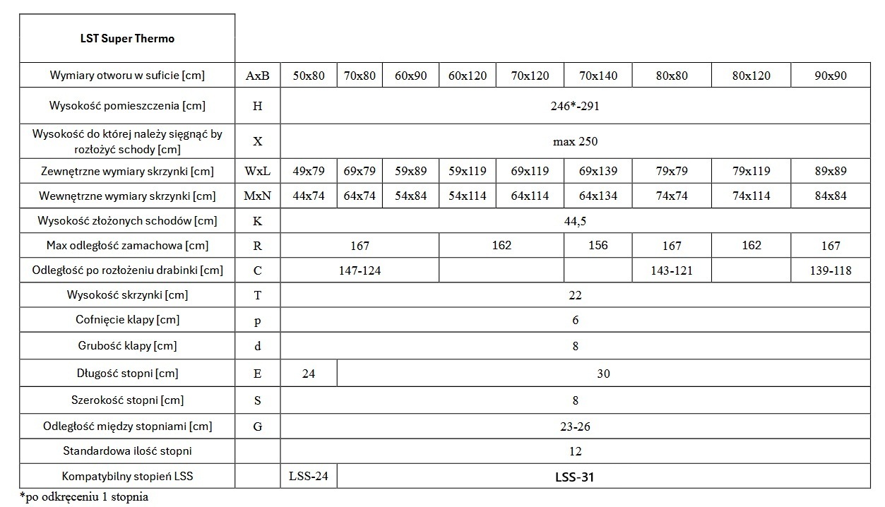 Schody Strychowe GREENSTEP LST Super Thermo to nowoczesne schody nożycowe, które łączą komfort użytkowania z energooszczędnością. Obustronnie biała klapa termoizolacyjna, wykończona elegancką okleiną ABS, doskonale wtapia się w sufit, tworząc spójną i estetyczną całość z każdym wnętrzem. Charakterystyczne policzki w kształcie litery „S” pełnią rolę poręczy na całej wysokości schodów, co znacząco podnosi komfort i bezpieczeństwo użytkowania. Grubość klapy wynosząca 80 mm, trzy uszczelki oraz współczynnik przenikania ciepła U=0,48 W/m²K zapewniają doskonałą izolację termiczną, co przekłada się na niższe koszty ogrzewania. Dzięki harmonijkowej konstrukcji i systemowi regulacji długości drabinki, schody te świetnie sprawdzą się w pomieszczeniach o niewielkich rozmiarach. Można je zamontować w otworach o wymiarach już od 50x80 cm do 80x120, schody standardowo dostępne w 9 wymiarach. Istnieje możliwość ich wykonania w wymiarach pod dedykowany wymiar otworu montażowego, Solidna, metalowa drabinka wytrzymuje obciążenie do 200 kg, zapewniając trwałość i bezpieczeństwo. Możliwość wydłużenia drabinki do wyższych pomieszczeniach do 336 cm przez dołożenia dodatkowych stopni LSS.