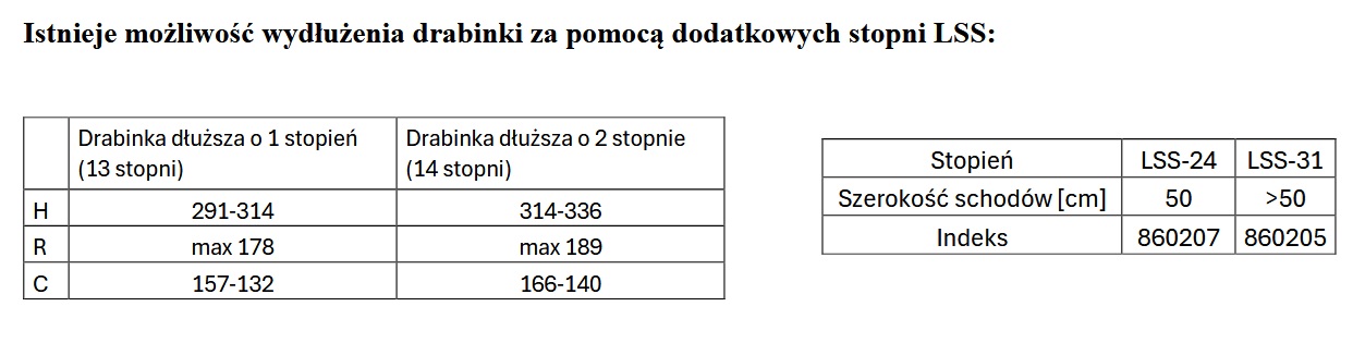 - Możliwość wydłużenia drabinki do wyższych pomieszczeniach do 336 cm przez dołożenia dodatkowych stopni LSS.