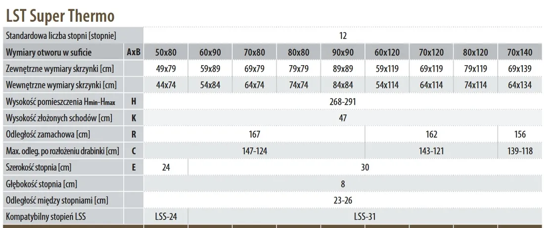Schody Strychowe GREENSTEP LST Super Thermo to nowoczesne schody nożycowe, które łączą komfort użytkowania z energooszczędnością. Obustronnie biała klapa termoizolacyjna, wykończona elegancką okleiną ABS, doskonale wtapia się w sufit, tworząc spójną i estetyczną całość z każdym wnętrzem. Charakterystyczne policzki w kształcie litery „S” pełnią rolę poręczy na całej wysokości schodów, co znacząco podnosi komfort i bezpieczeństwo użytkowania. Grubość klapy wynosząca 80 mm, trzy uszczelki oraz współczynnik przenikania ciepła U=0,48 W/m²K zapewniają doskonałą izolację termiczną, co przekłada się na niższe koszty ogrzewania. Dzięki harmonijkowej konstrukcji i systemowi regulacji długości drabinki, schody te świetnie sprawdzą się w pomieszczeniach o niewielkich rozmiarach. Można je zamontować w otworach o wymiarach już od 50x80 cm do 80x120, schody standardowo dostępne w 9 wymiarach. Istnieje możliwość ich wykonania w wymiarach pod dedykowany wymiar otworu montażowego, Solidna, metalowa drabinka wytrzymuje obciążenie do 200 kg, zapewniając trwałość i bezpieczeństwo. Możliwość wydłużenia drabinki do wyższych pomieszczeniach do 336 cm przez dołożenia dodatkowych stopni LSS.