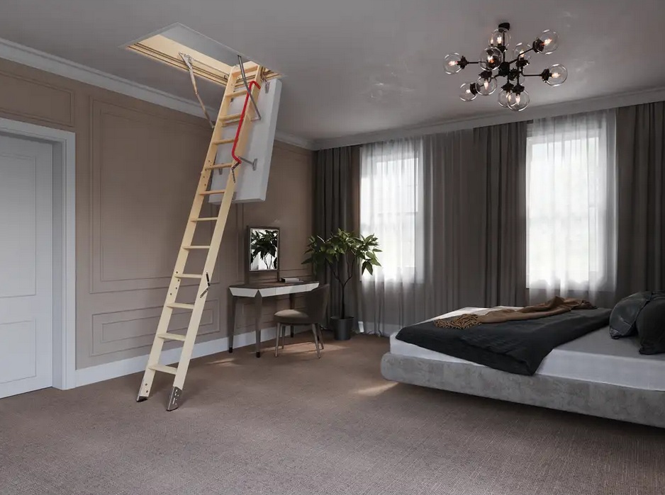 - Minimalistyczny design po zamontowaniu schodów w stropie - klapa wystaje zaledwie 0,5 cm poniżej powierzchni sufitu.