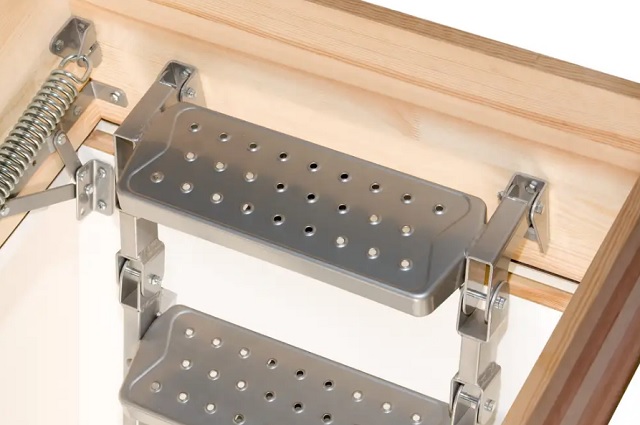 - Okucia: Zaczep sprężyny usztywnia skrzynkę i zapobiega zmianie przekątnych skrzynki. Dzięki temu, że skrzynka nie deformuje się schody można bezproblemowo używać przez wiele lat. Specjalna konstrukcja zawiasów zwiększa sztywność elementów ruchomych.