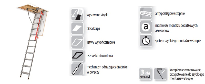 - Drabinka: Występuje w wersji 3 segmentowej. Jej znaczne odsunięcie od klapy schodów sprawia, że można wygodnie postawić stopę na drabince schodów.