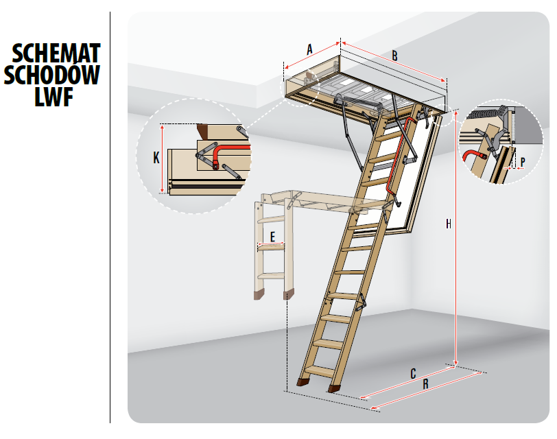 - system montażu umożliwiający łatwe zamontowanie schodów przez dwie osoby oraz dopasowanie długości drabiny do wysokości pomieszczenia