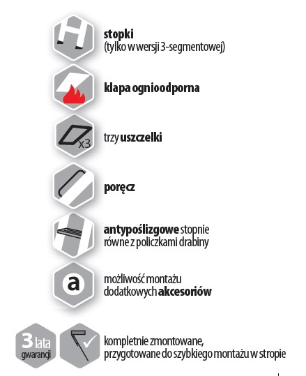 - klapa schodów wyposażona w uszczelkę pęczniejącą, która pod wpływem wysokich temperatur zwiększa swoją objętość i zapobiega przedostawaniu się ognia i dymu na kondygnację wolną od ognia