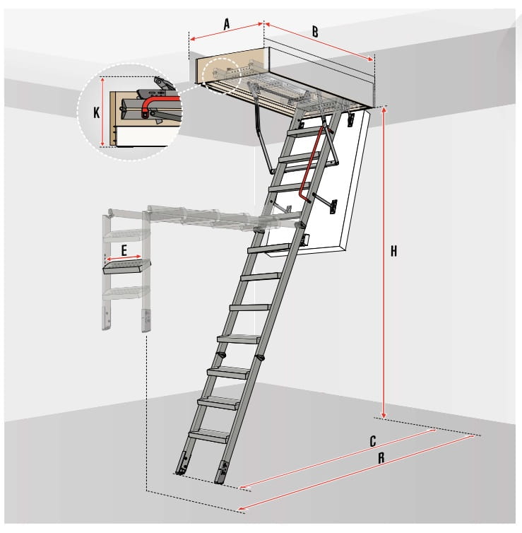 * dla pomieszczeń niższych niż maksymalna standardowa wysokość H należy dopasować długość drabiny zgodnie z instrukcją montażu