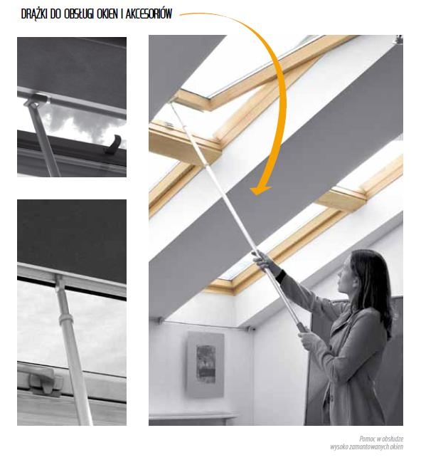 Uniwersalny drążek teleskopowy ZST pozwala na łatwe otwieranie wysoko zamontowanych okien. Służy również do sterowania roletami ARS, ARP, ARF, żaluzją AJP oraz moskitierą AMS, które zamontowane są poza bezpośrednim zasięgiem użytkownika. Długość drążka wynosi 119 cmi posiada możliwość regulacji na długość 134, 162, 190 i 218 cm.