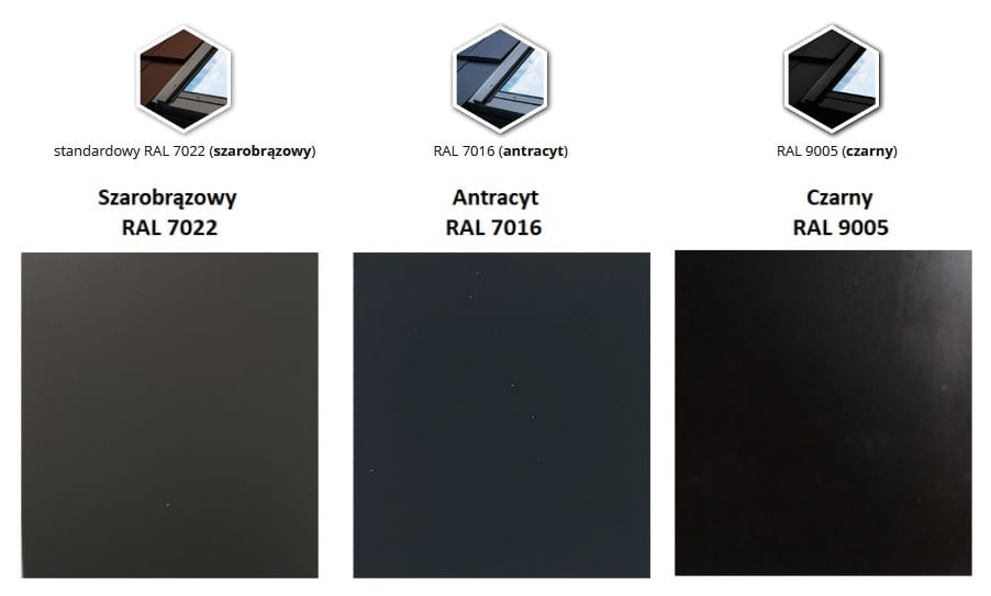 Ceny wyłazów są uzależnione o koloru oblachowania zewnętrznego (wszystkie 3 kolory dostępne w naszej ofercie, RAL 7016 oraz RAL 9005 są pod zamówienie)
